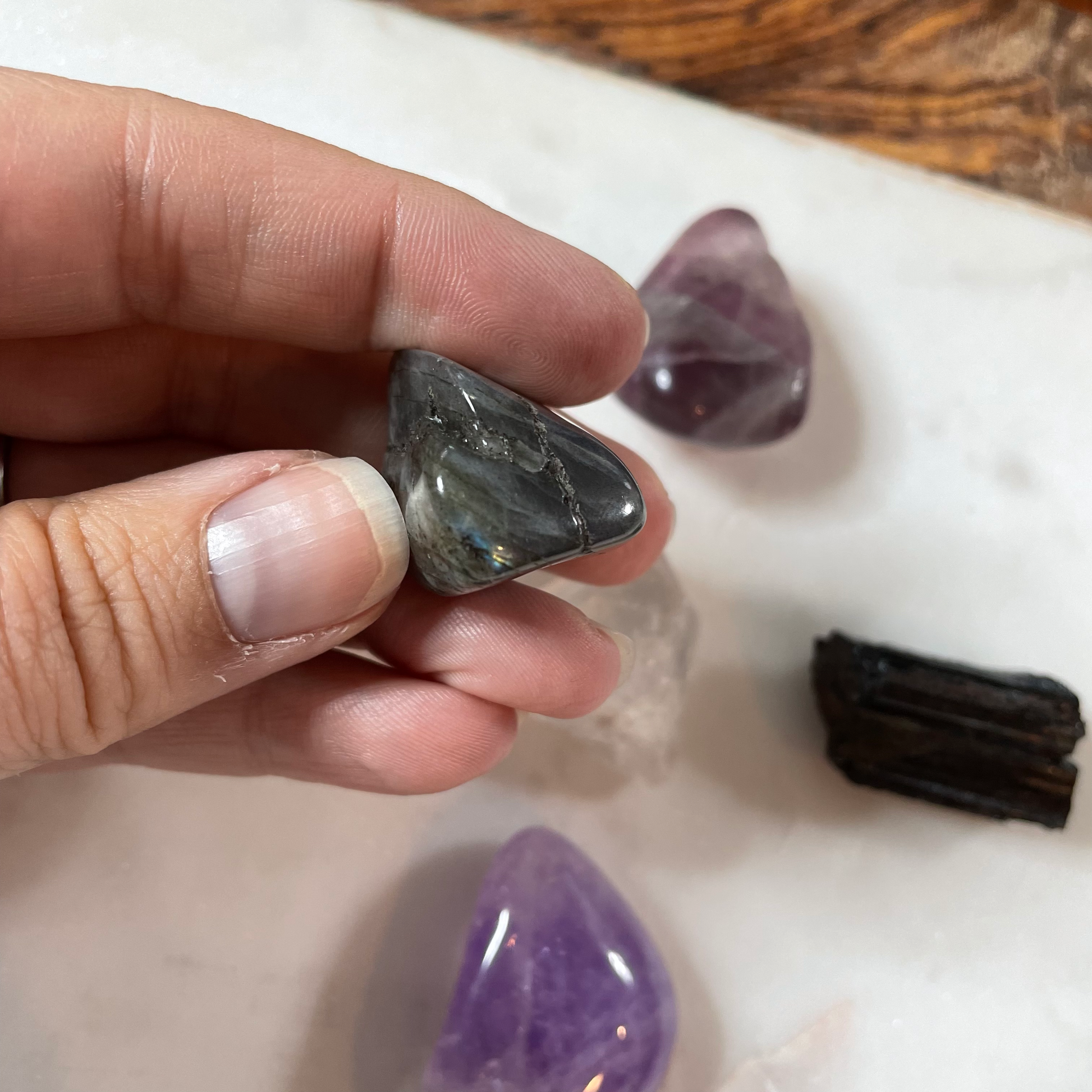 Labradorite (grey stone with blue or golden flash) - This stone is straight-up magic. Its calming influence will allow your innate strengths to rise, especially around your intuition and connection to the divine being of your choice.