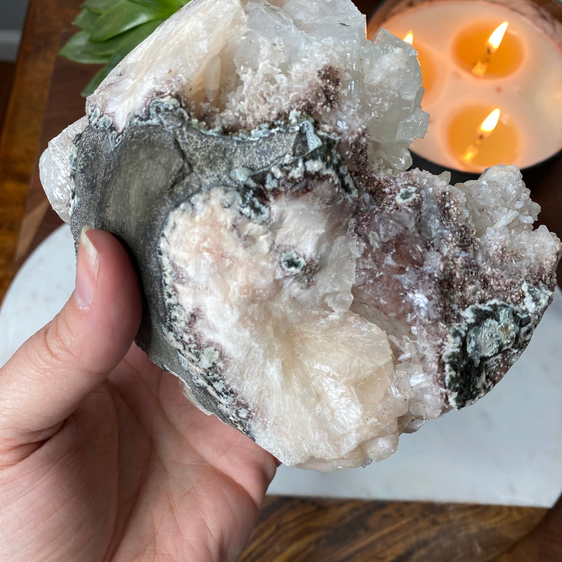 Stilbite has a lovely, soft energy to it. The peachy hue and gently rounded formations ease you into feeling love and joy. Stilbite will peacefully open you up to receiving divine downloads from your intuition and through your connection to Source.