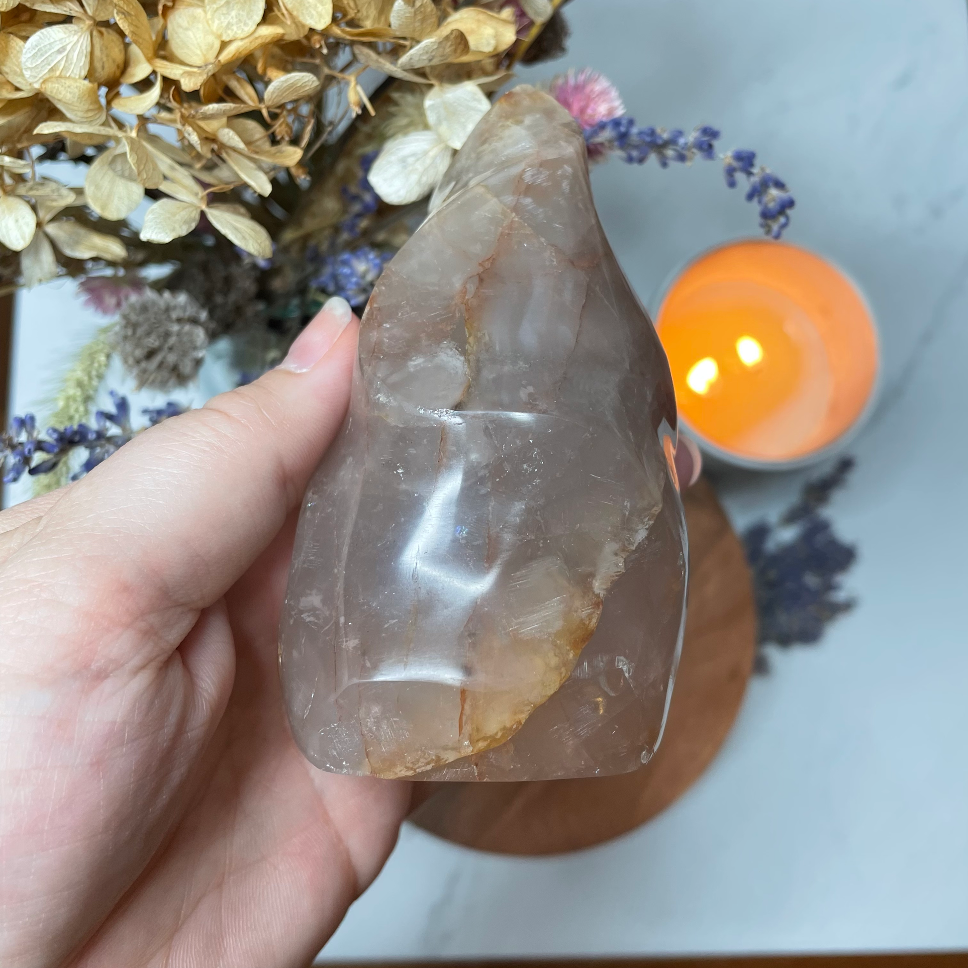Fire Quartz, or Hematoid Quartz occurs when a fine dust or veins of Hematite are incorporated within the Clear Quartz crystal as it grows.