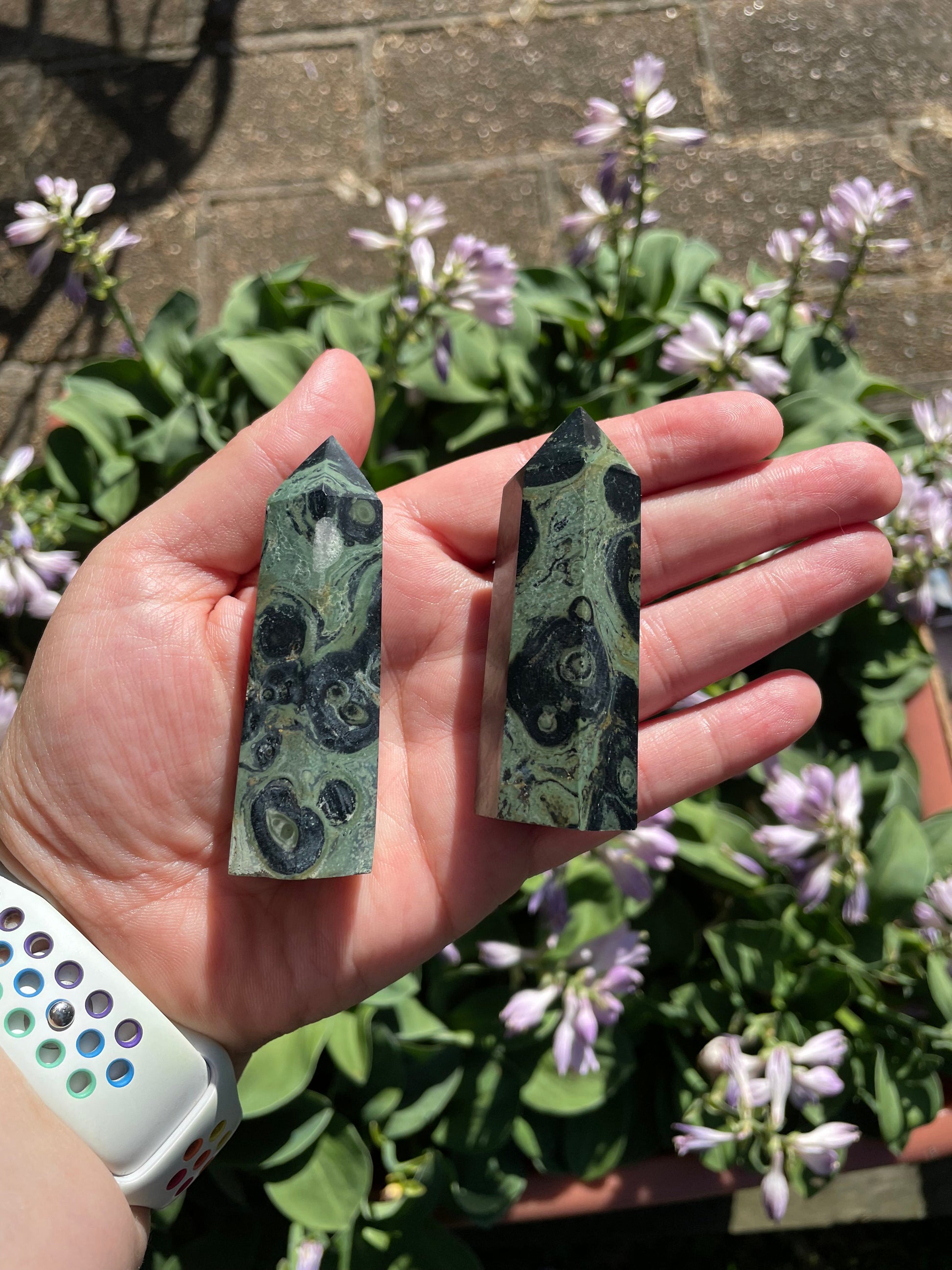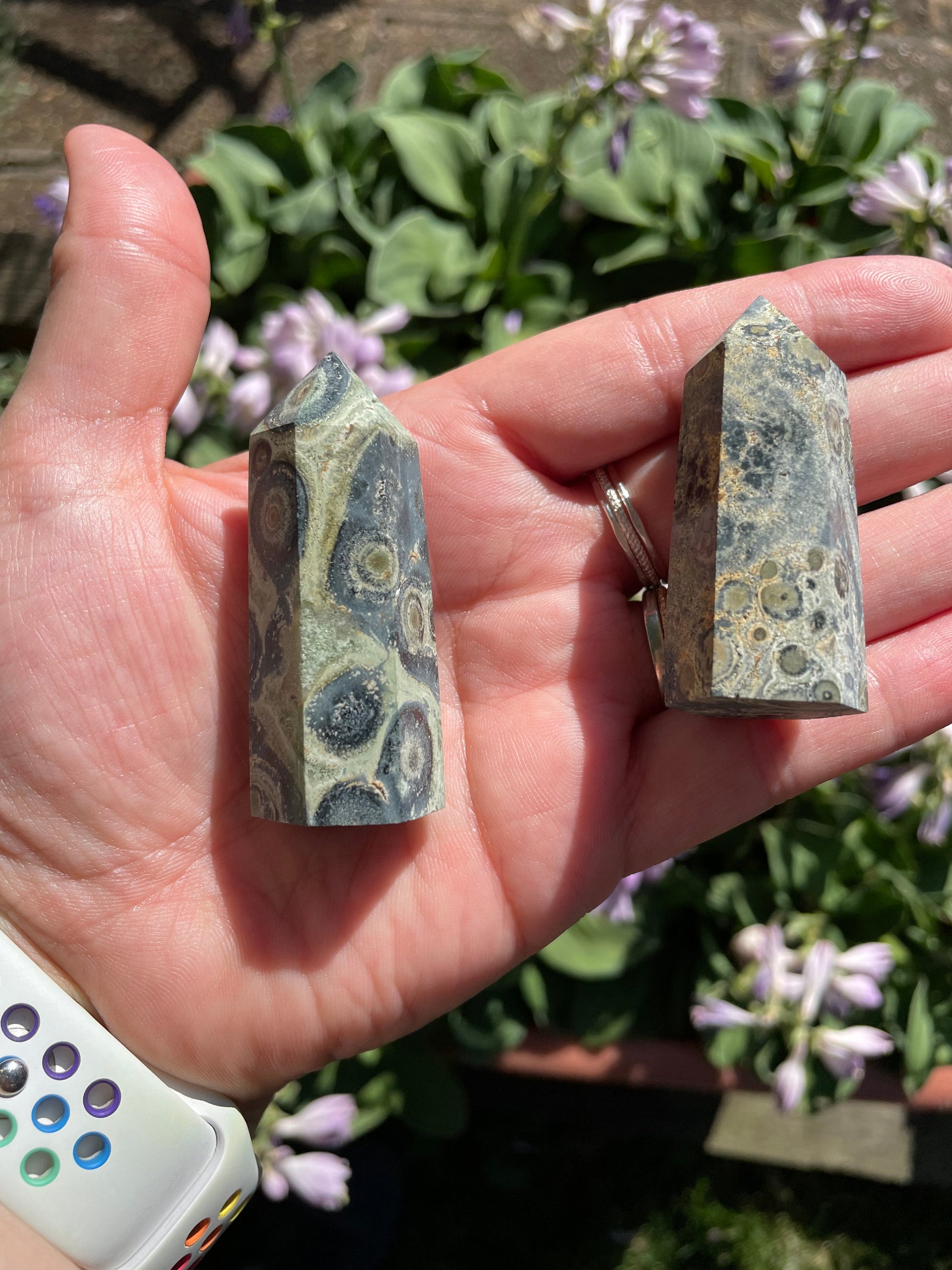 Details: This listing is for *one* crystal/stone, which will be intuitively selected for you. Each large tower is approximately 2.75" tall and 0.75" across the base. The medium towers are approximately 2.25" tall and 0.75" across the base.