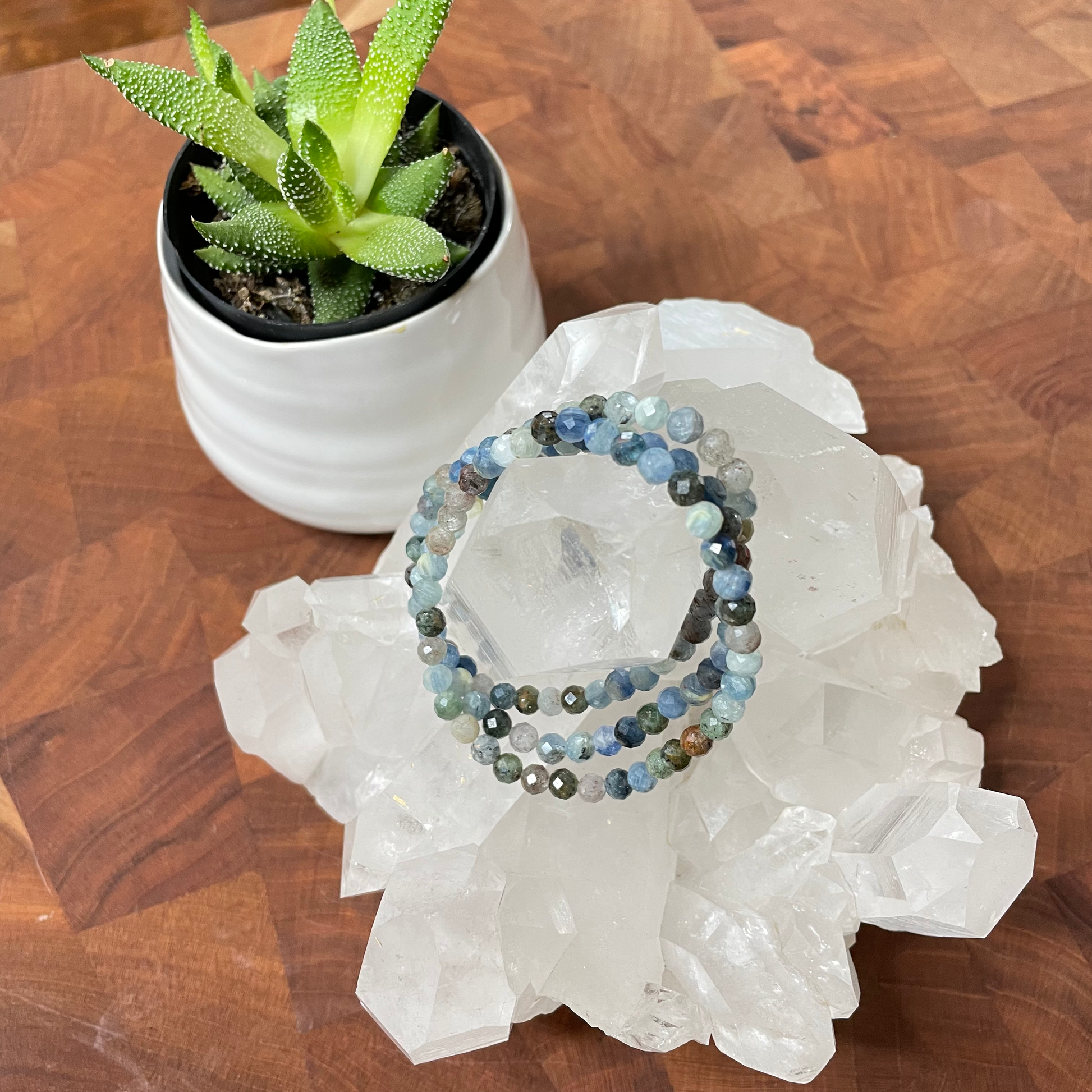 Kyanite is a stone of connection and communication. I find it useful for both working with my intuition and when trying to communicate with others. Tough conversation coming up? Slip this bracelet on to support your intentions.