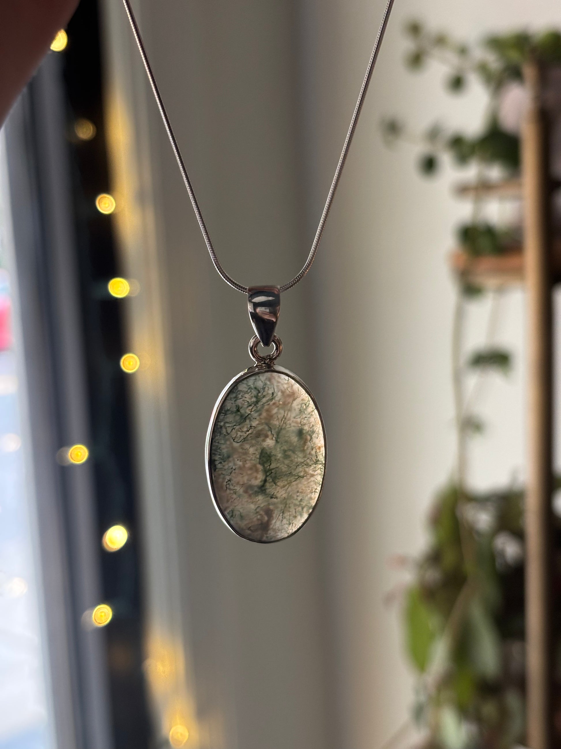 We have two stunning, jewelry grade Moss Agate Pendants to add to your wearable crystal collection. These high quality stones are set in sterling silver.