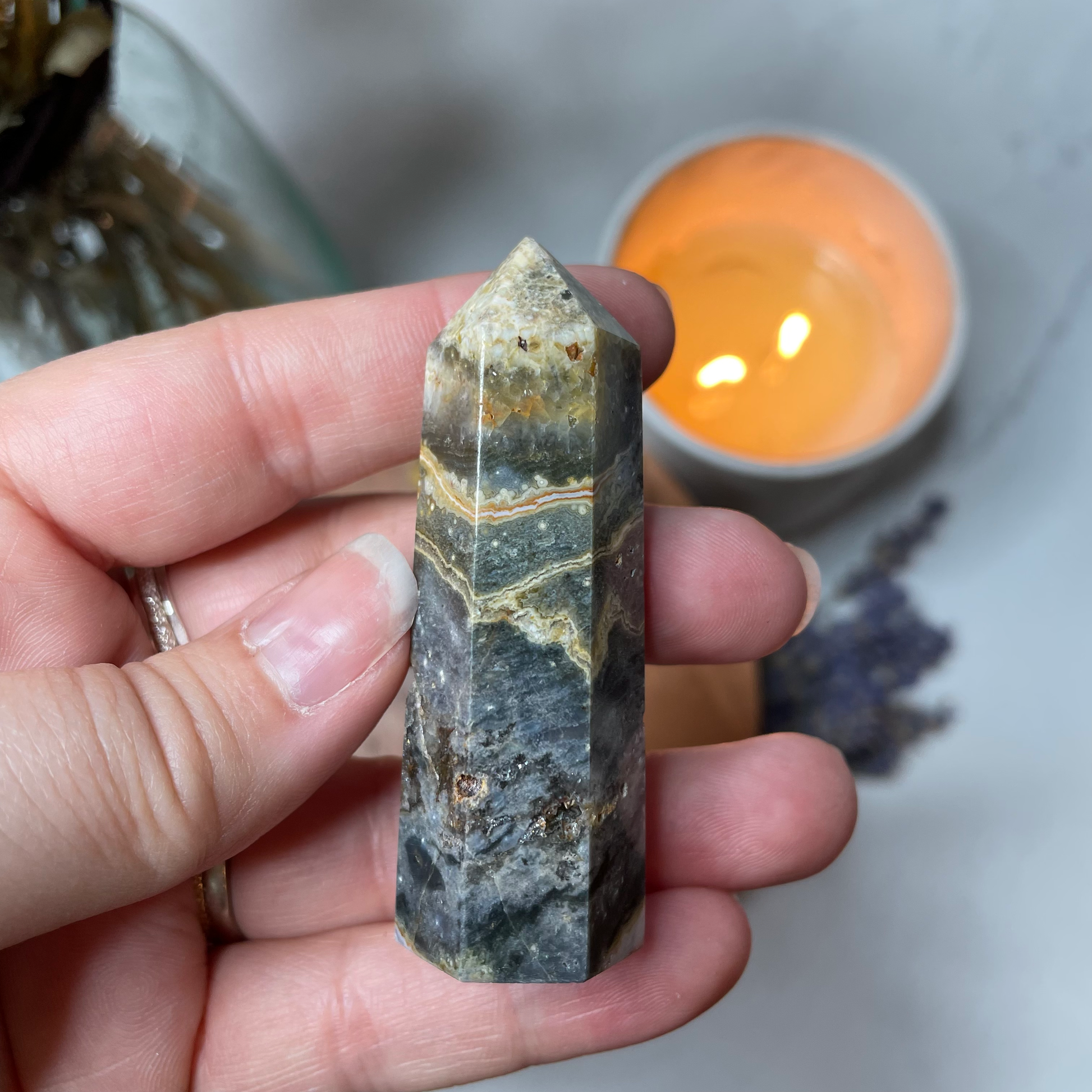 Ocean Jasper works on your throat, heart and solar plexus chakras and asks you to dive deep and heal not only your inner child, but also wounds that exist in the collective. It supports you while you do this work and in communicating your Truth to yourself and others.