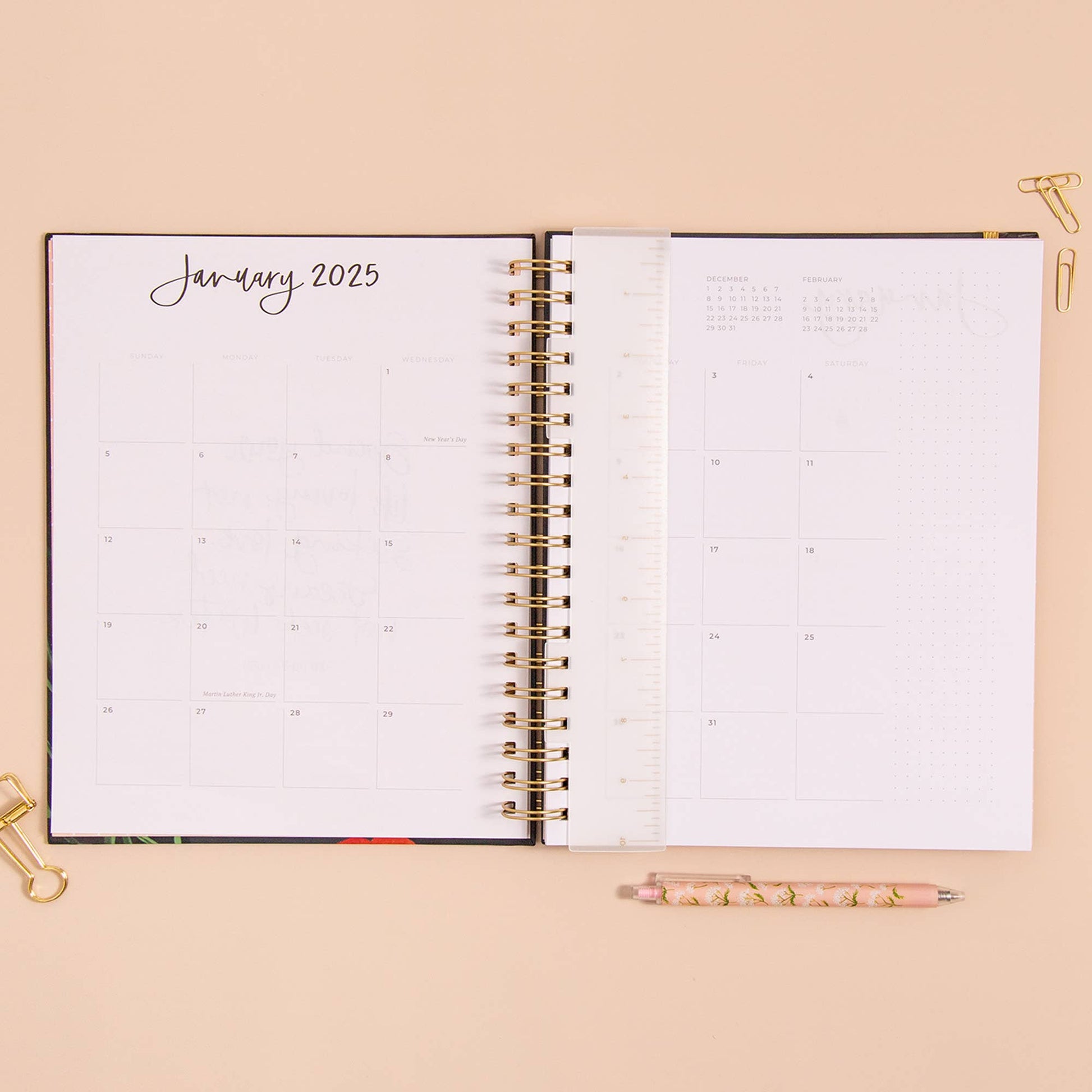 Features // Hard cover, gold wire-o binding, elastic closure, snap-in acrylic ruler bookmark, dot grid weekly view pages