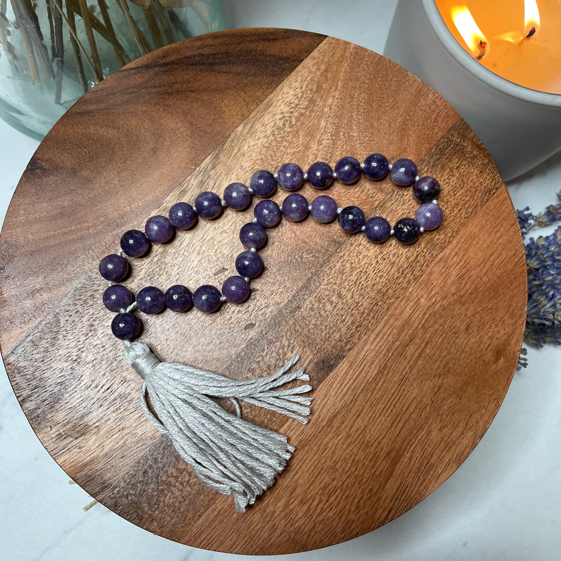 Details: This set of meditation beads measures 7.5 inches in total length, with a circumference of 10 inches. It is too long to wear as a bracelet. It is made with 8mm round Lepidolite beads. These beads are perfectly sized for running through your fingers during meditation.