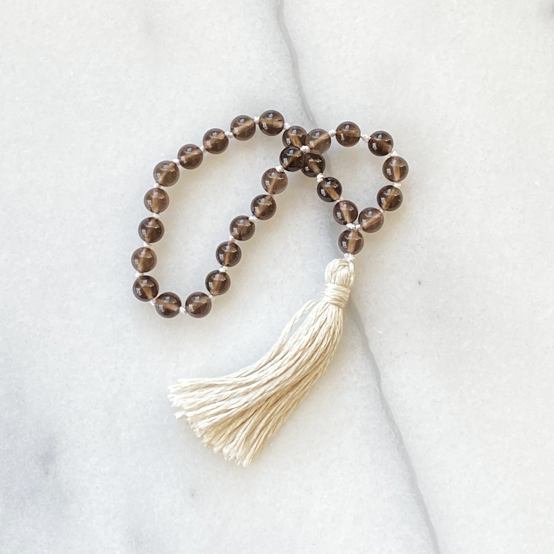 Each is constructed from 27 beads plus a focus bead, with hand-tied knots of silk cord in between each bead and a silk tassel at the end.