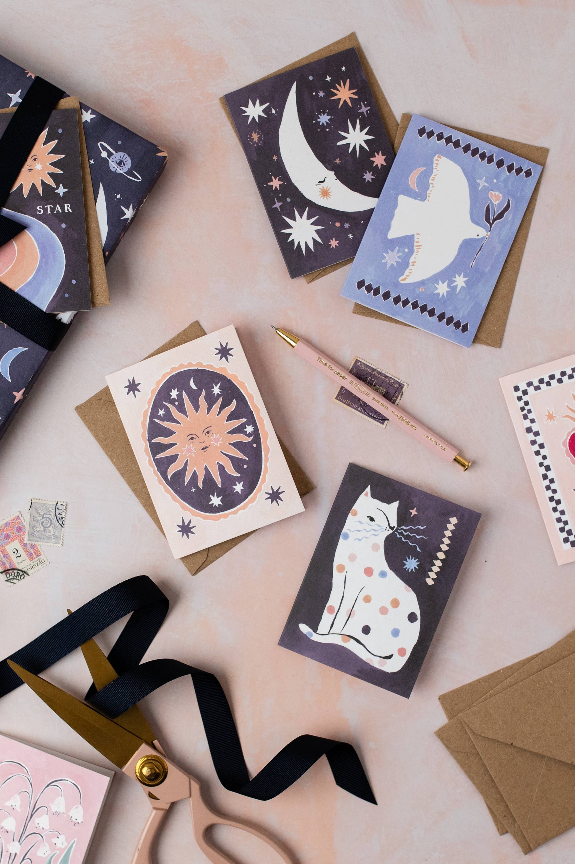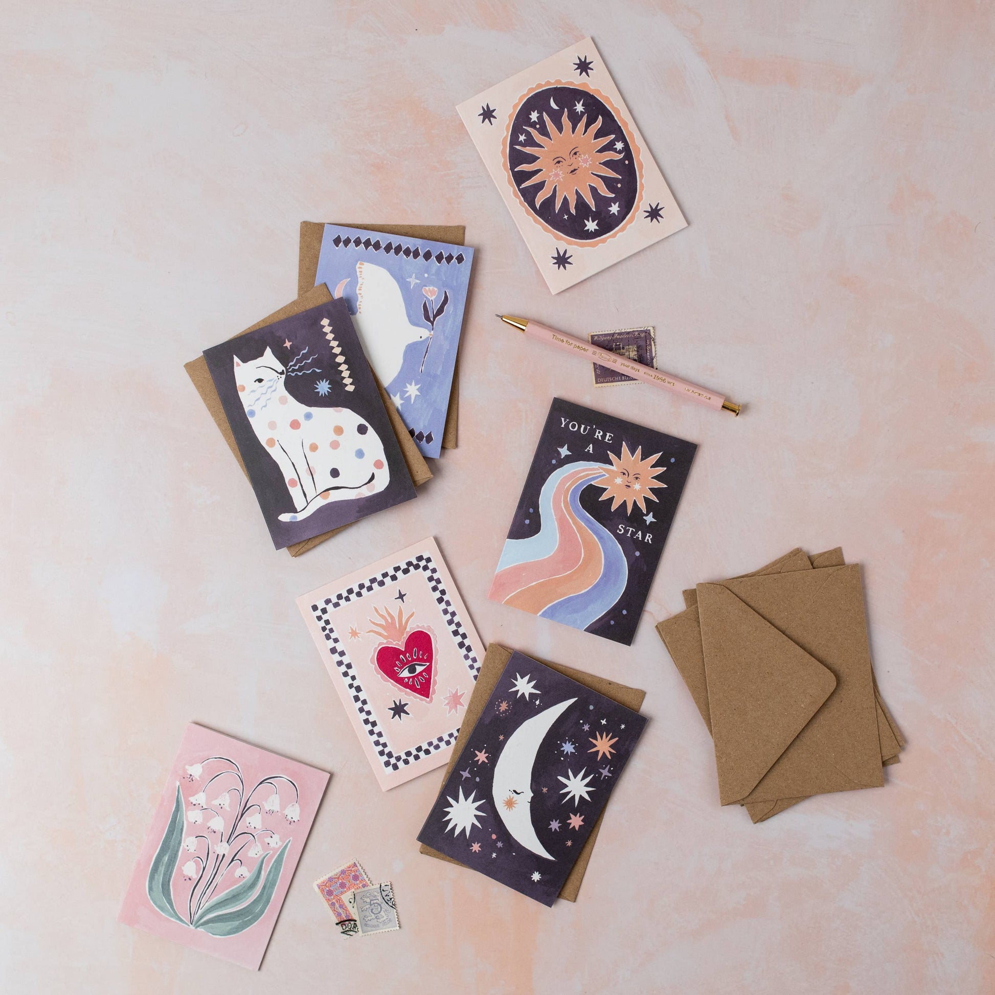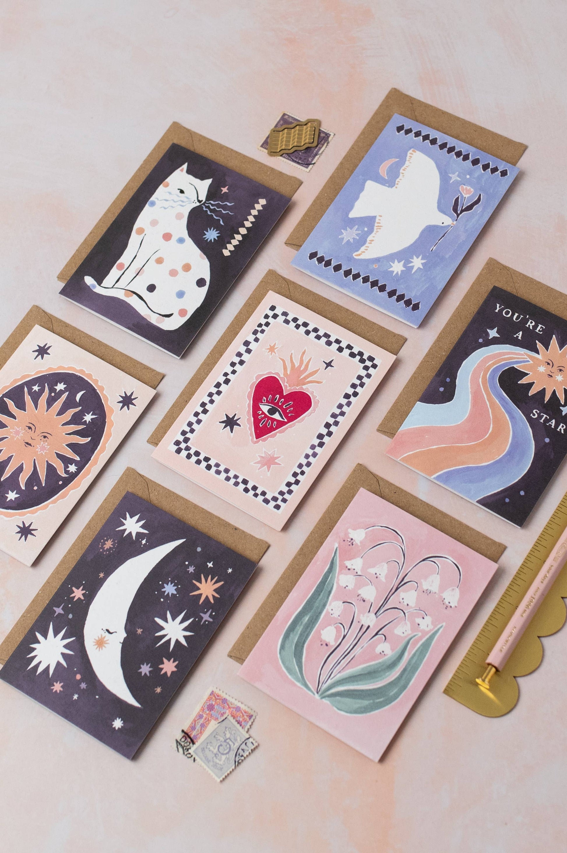 A snoozing crescent moon takes a well-deserved rest on this mini card, surrounded by a supportive network of wonky stars that fill the night sky.