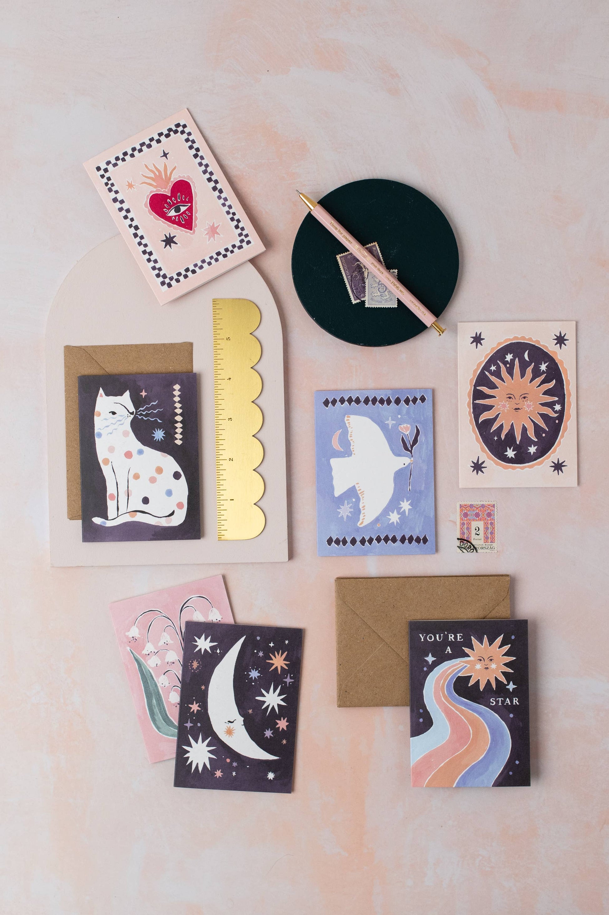A smiling sun radiating joy and happiness stands out in a starry night sky framed in gold and pastels.