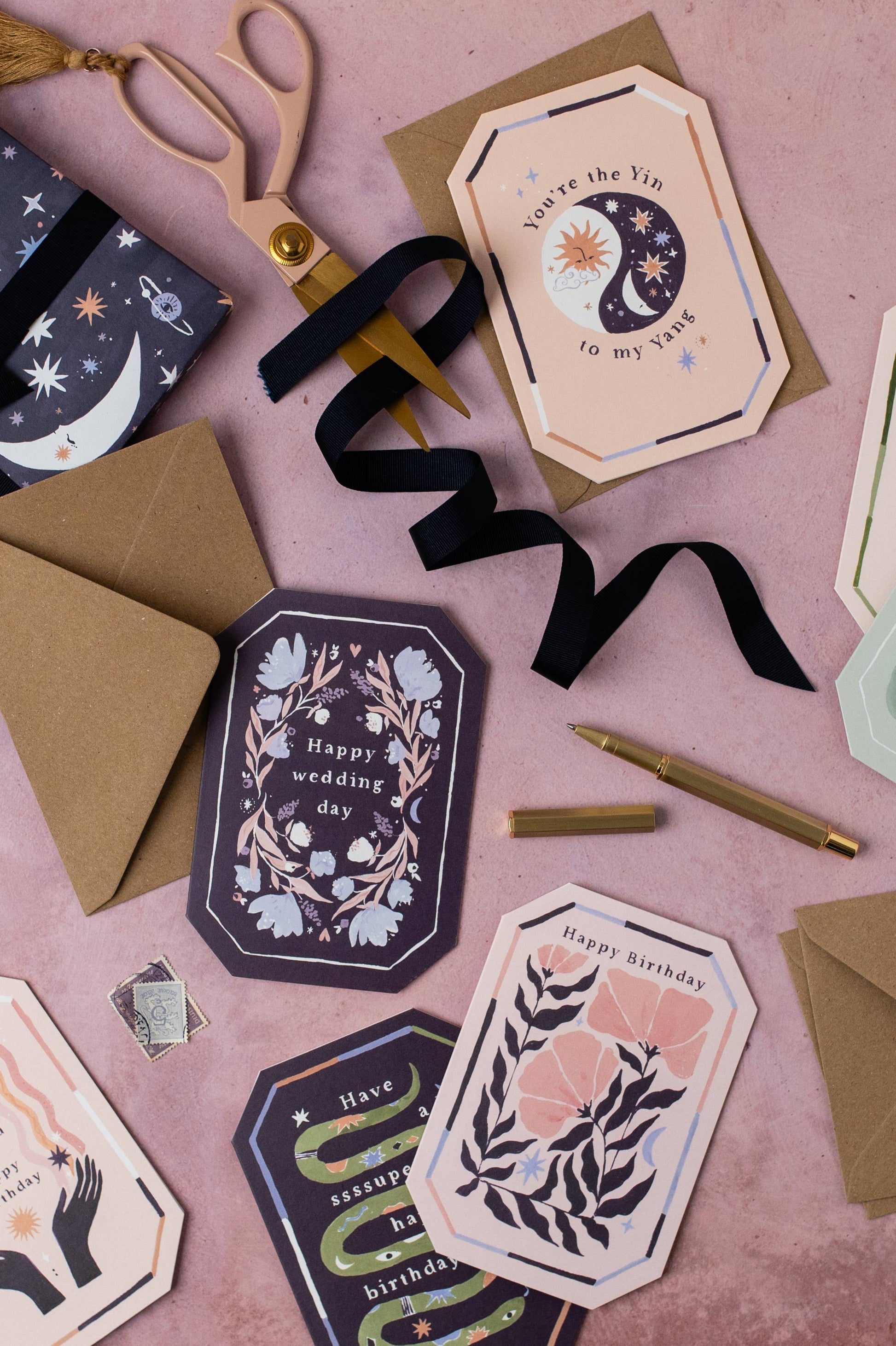 A suave green snake patterned with eyes, stars and moons slithers on the front of this gem-shaped birthday card, meandering between the hand-lettered caption reading “Have a ssssuper happy birthday”.