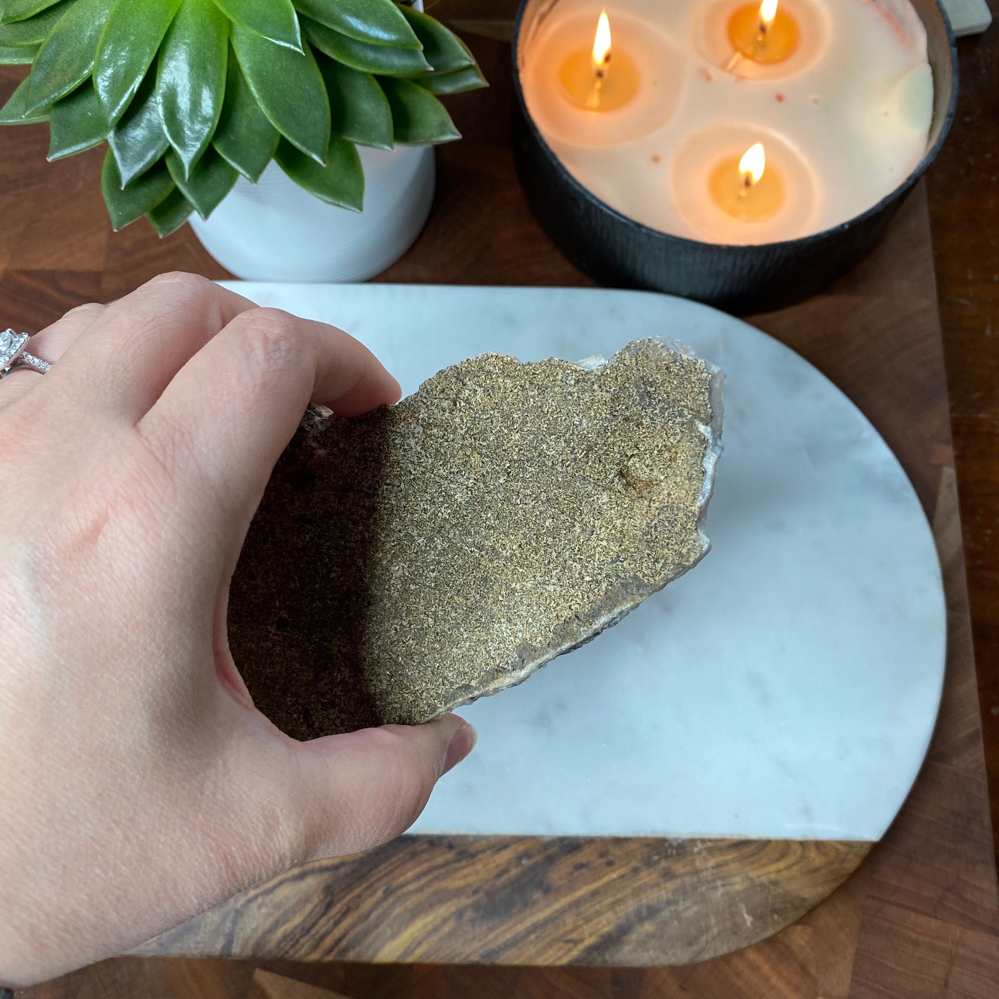 Stilbite has such a soft energy to it. The peachy hue and gently rounded formations ease you into feeling love and joy. Stilbite will peacefully open you up to receiving divine downloads from your intuition and through your connection to Source.