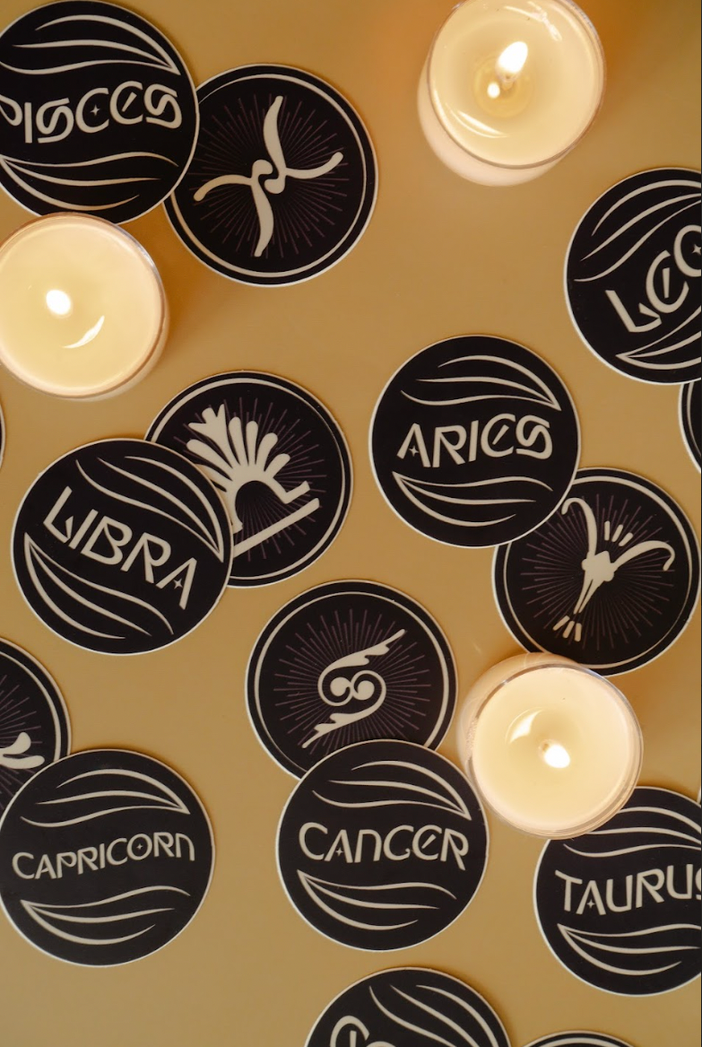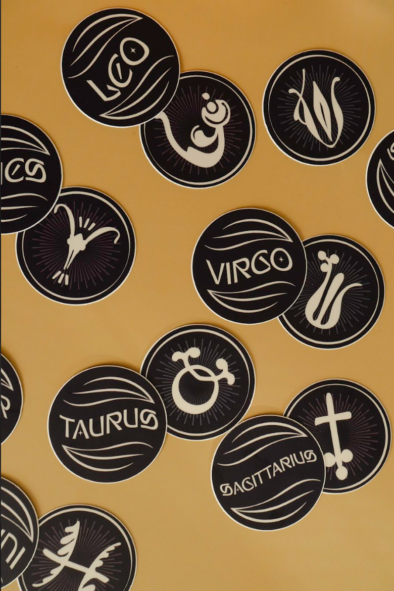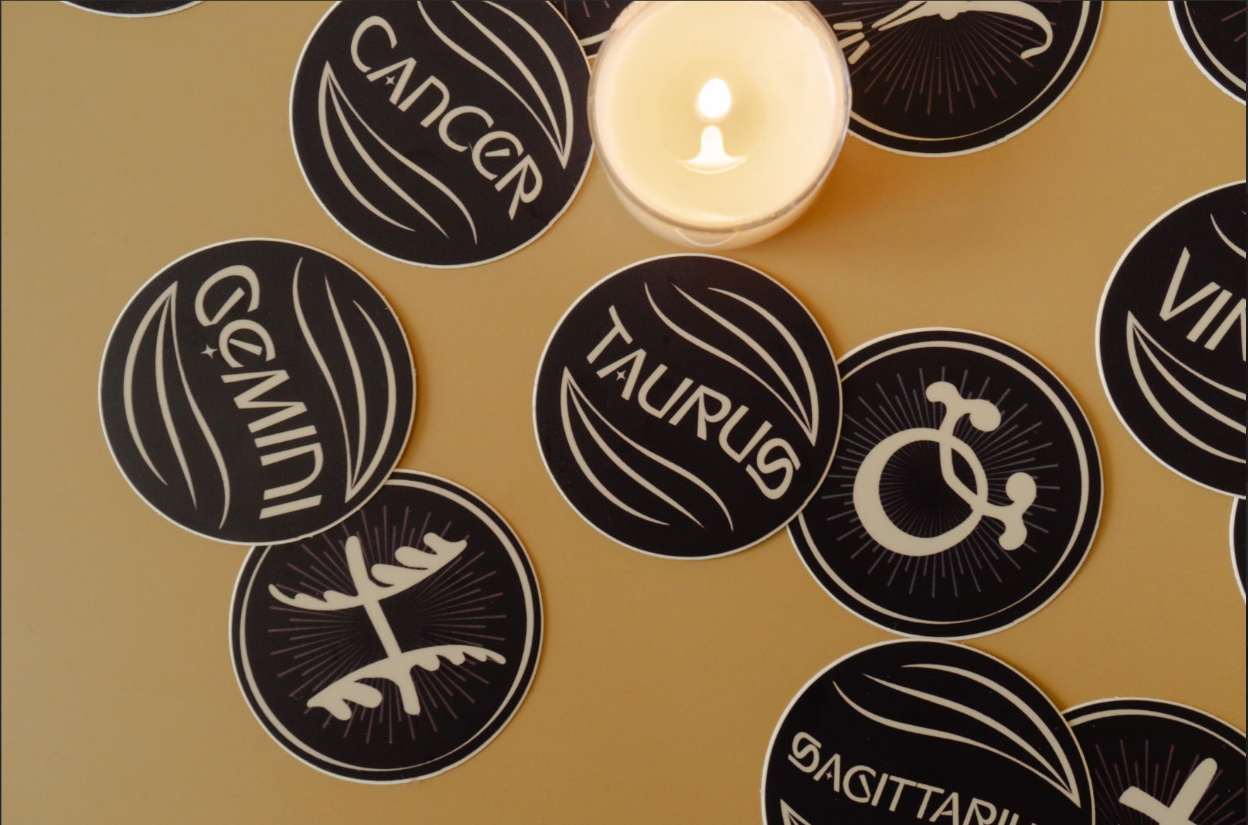 - Two circle stickers, one with the name of your zodiac sign and one with an icon representing it.